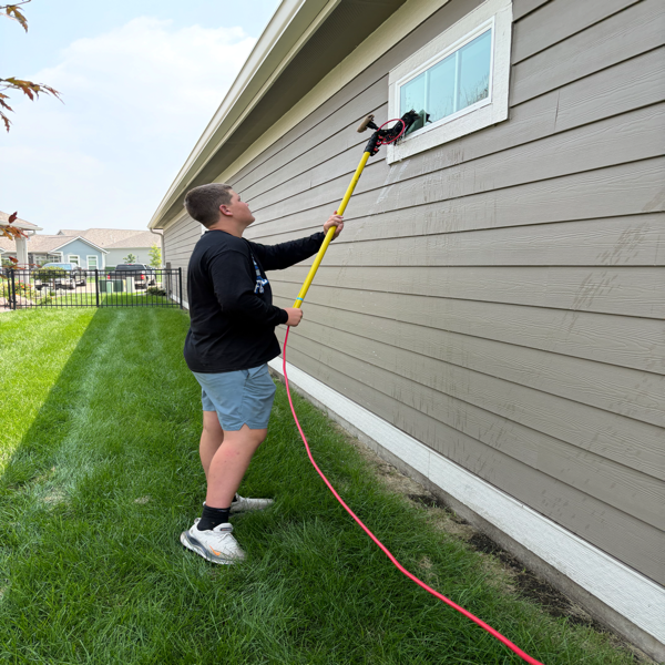 Our telescoping water-fed poles reach up to 70 feet, safely cleaning multi-story homes and commercial buildings from the ground — no ladders, no risk.